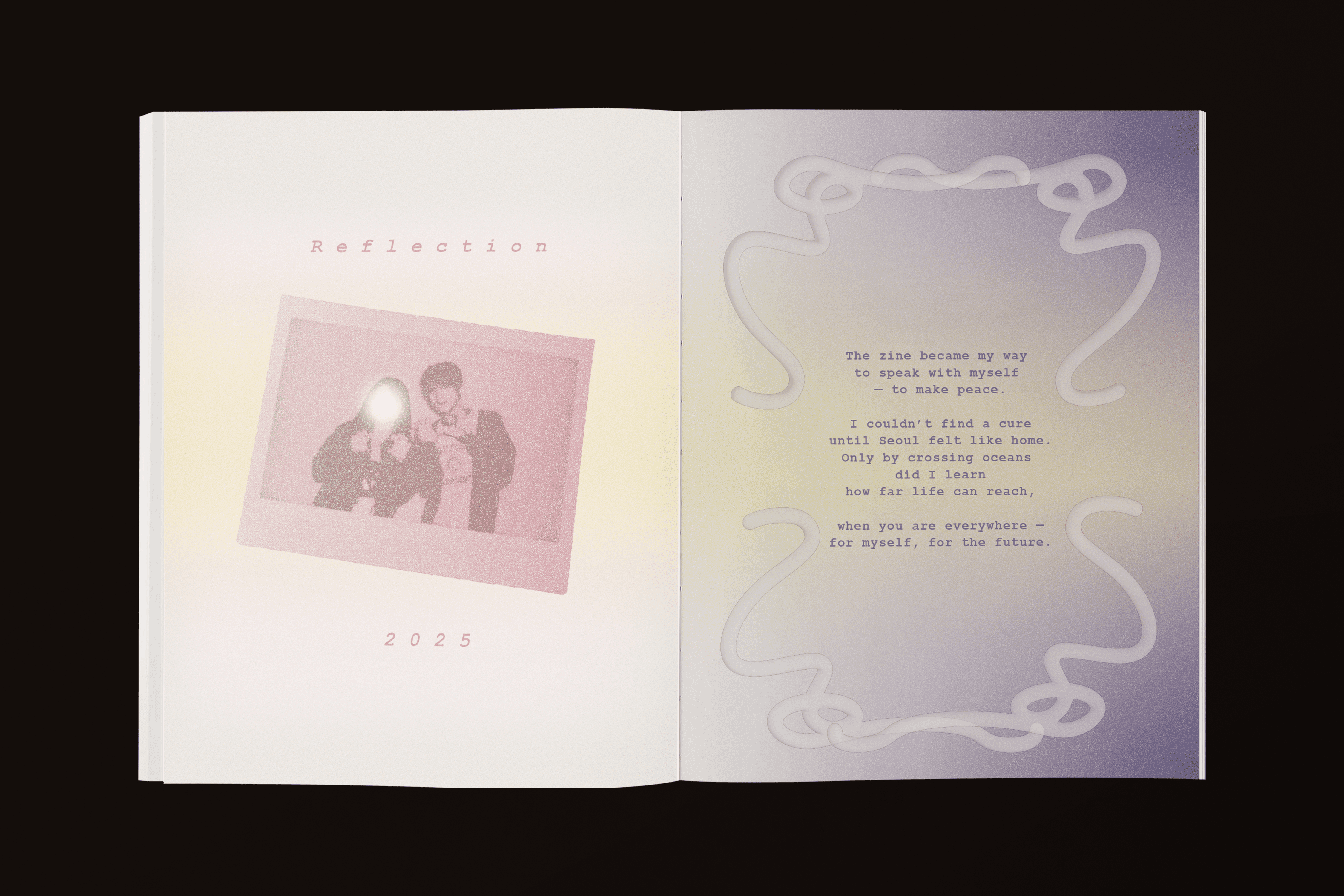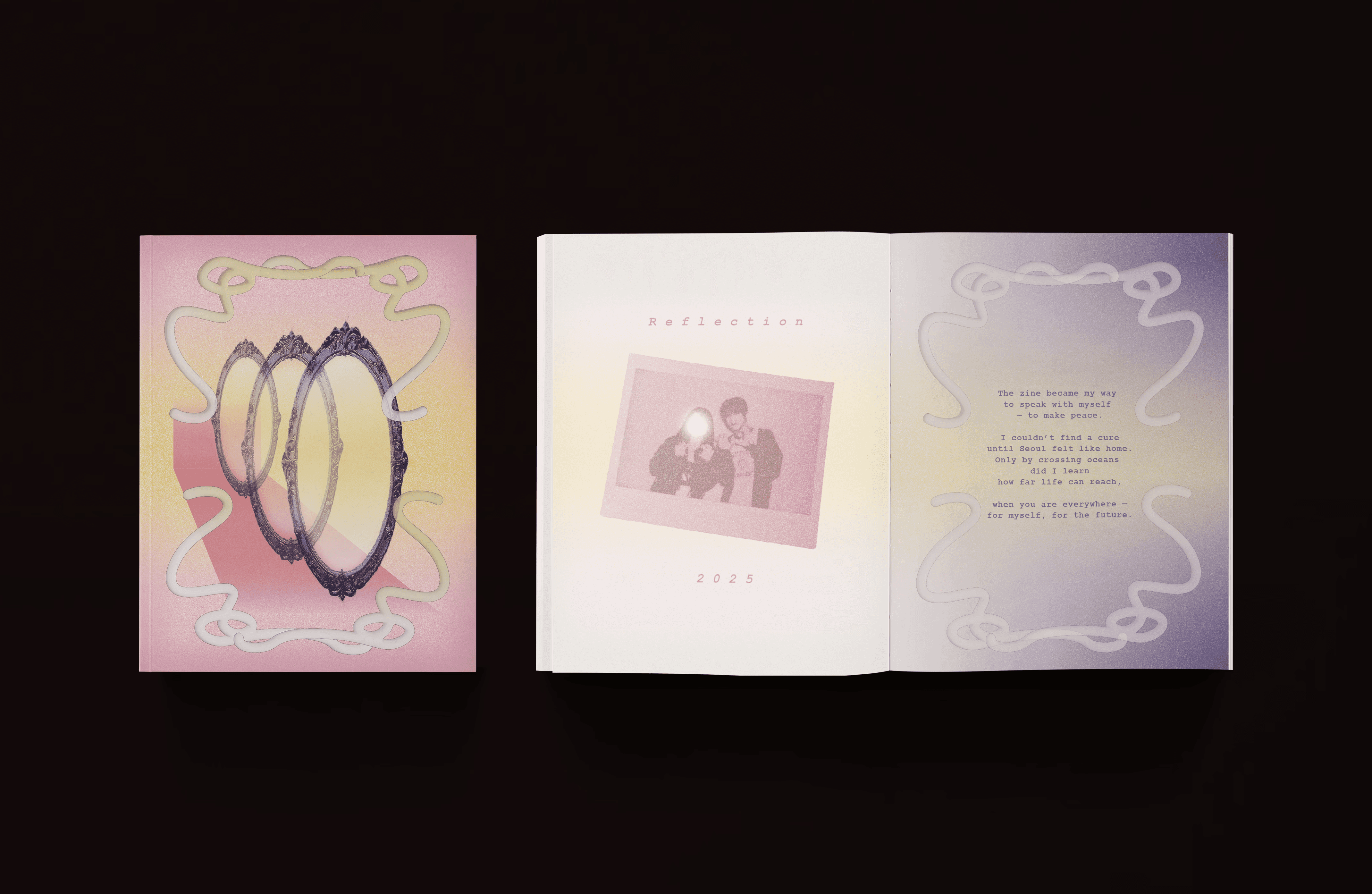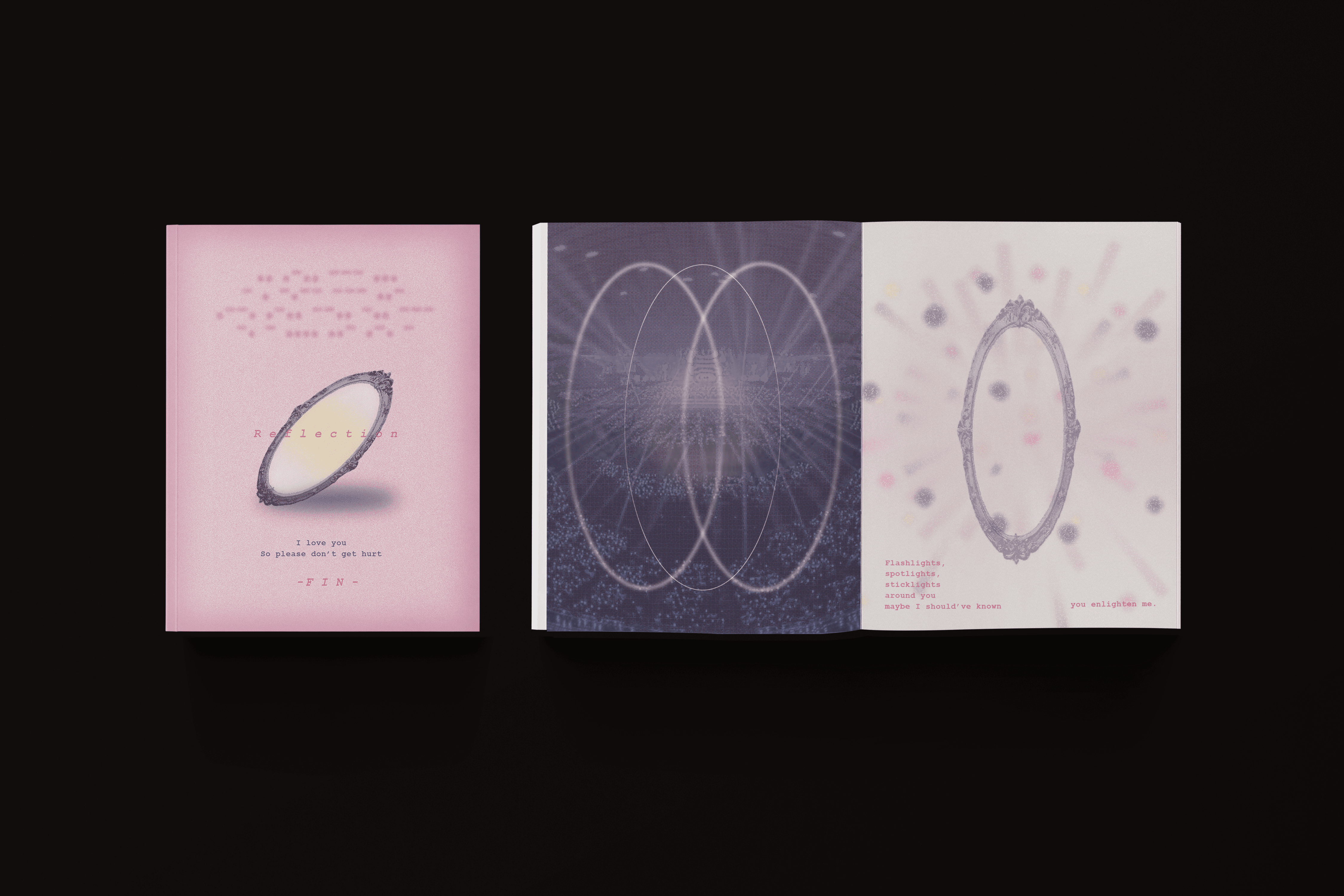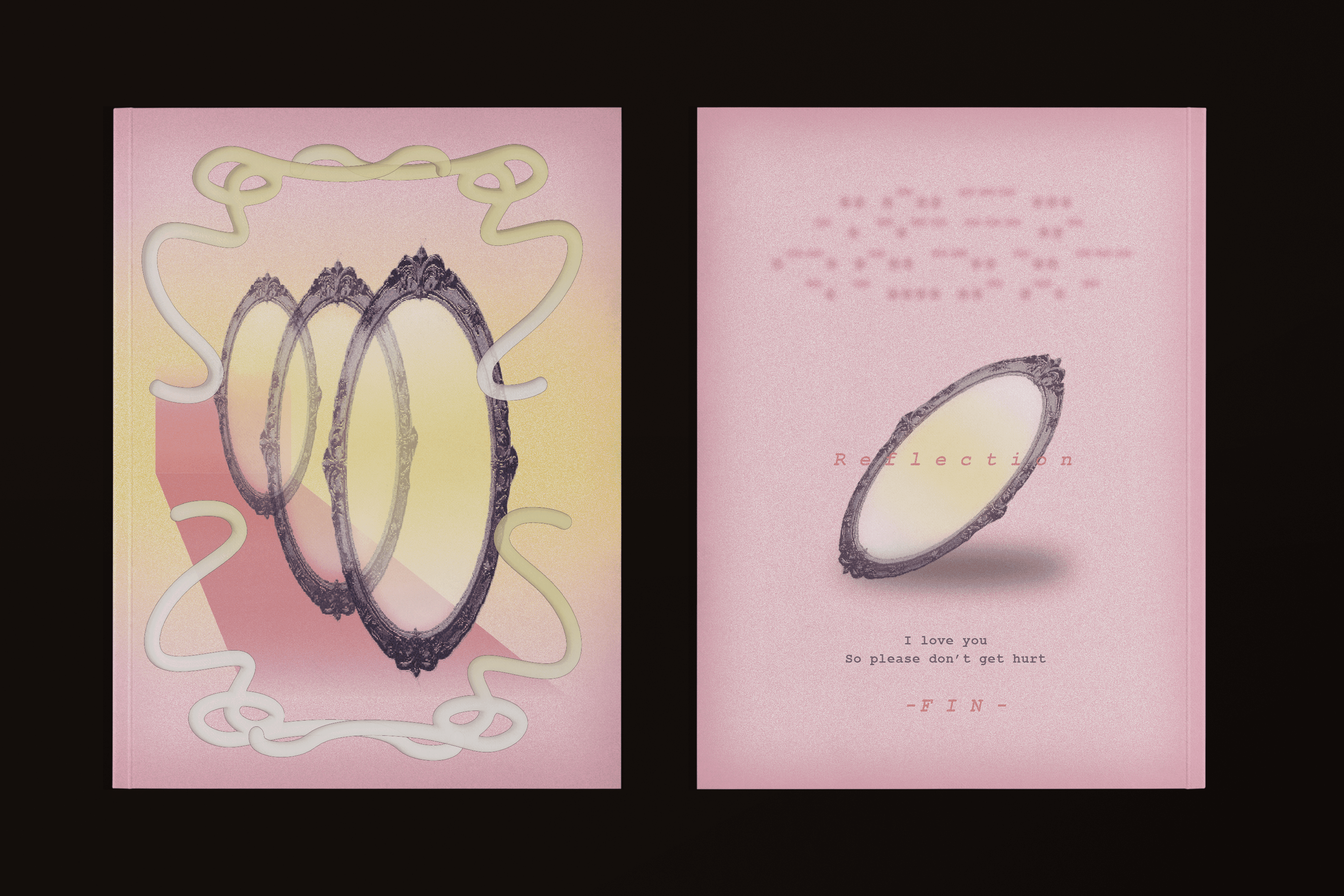 This zine draws on personal experience to reflect on how fandom culture in popular media shapes individual emotions and self-identity. The mirror functions as a metaphor for self-projection, revealing that fandom is not a one-way act of admiration, but a process of self-construction that relies on the “other.”